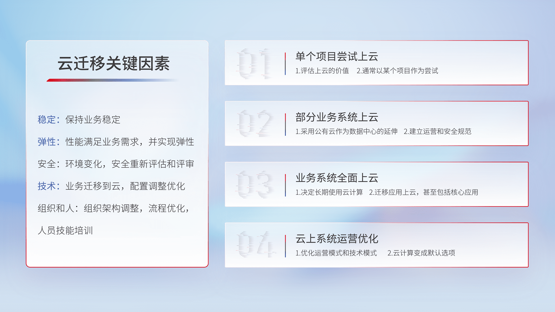 结合实际业务,,从规划设计、、云平台选型、、、云原生改造、、、、数据迁移、、集成交付,,,迁移全过程为客户识别最佳上云路径,,做好风险识别管理,,,设计网络架构、、、、身份权限、、安全审计合规、、、操作审计、、、日志审计、、监控告警策略、、多站点容灾设计等,,对云上基础设施进行整体规划,,,提升IT治理水平,,以满足弹性、、、高可用、、高性能的需求。。。